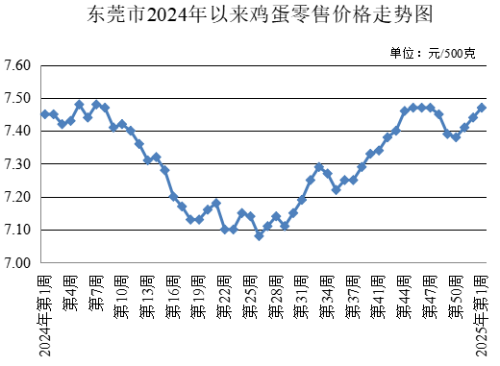 本周雞蛋農(nóng)貿(mào)市場平均零售價格每500克7.47元,較上周上升0.54%。