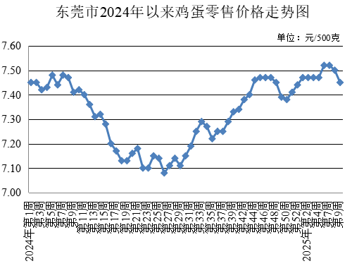 第9周,所監(jiān)測的雞蛋農(nóng)貿(mào)市場零售均價為每500克7.45元,較上周下降0.67%。
